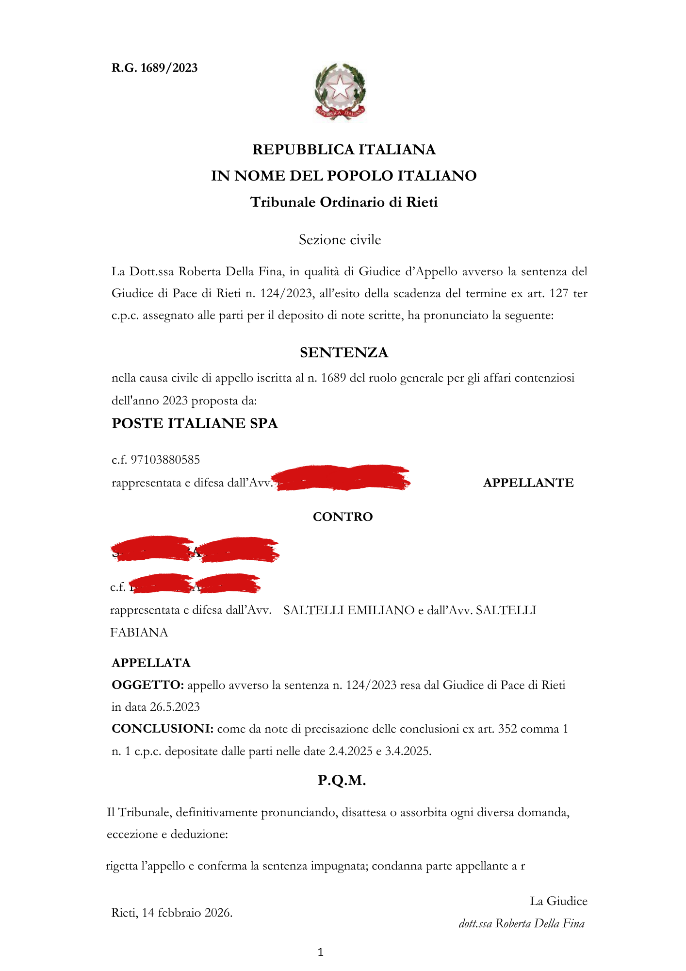 Si tratta di una vittoria confermata in appello contro Poste Italiane, davanti a un Tribunale ordinario.