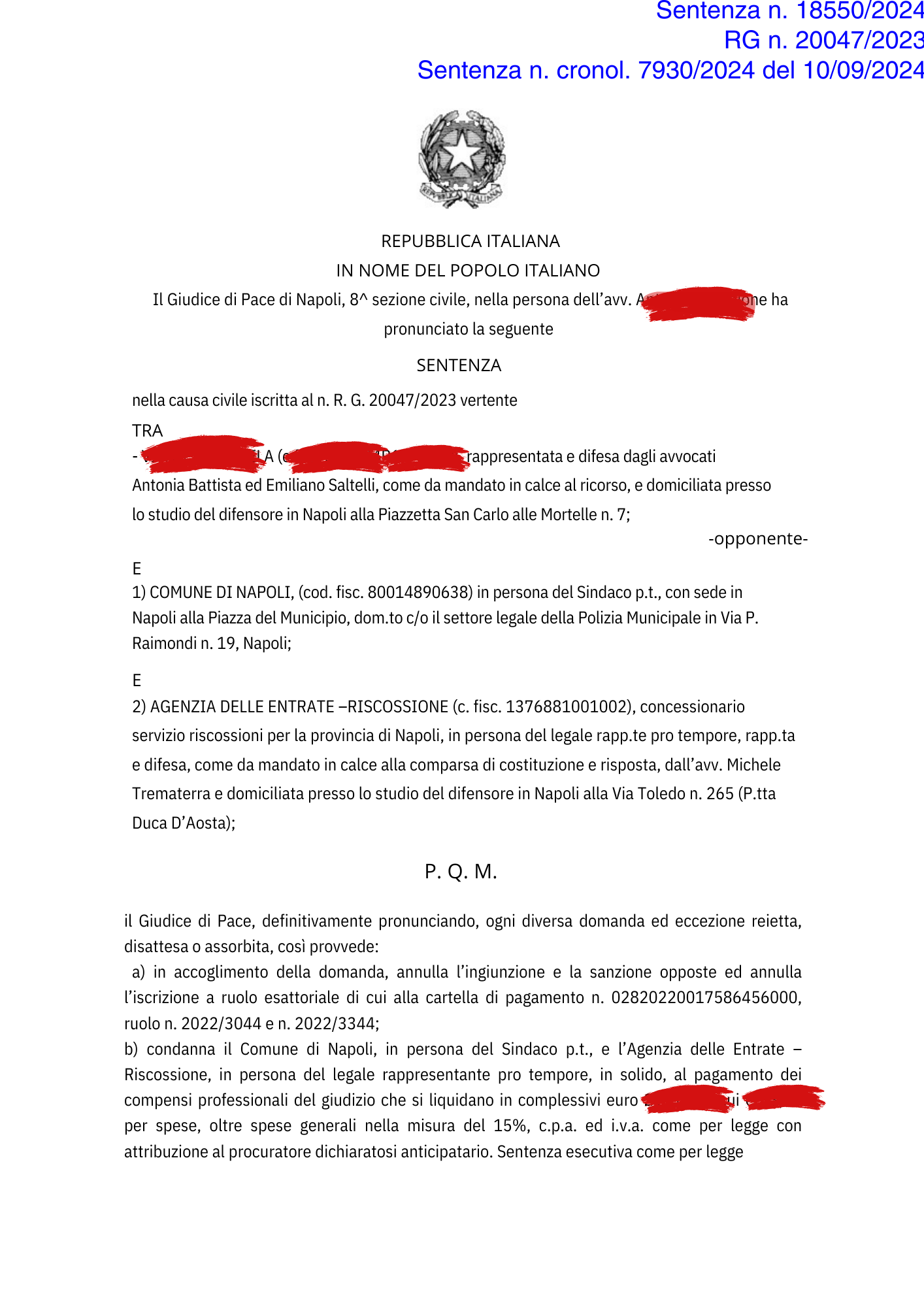 Un’altra vittoria importante per il nostro studio legale! Il Giudice di Pace di Napoli ha accolto il ricorso presentato contro una cartella esattoriale illegittima, annullando la sanzione imposta dal Comune di Napoli e dall’Agenzia delle Entrate – Riscossione.