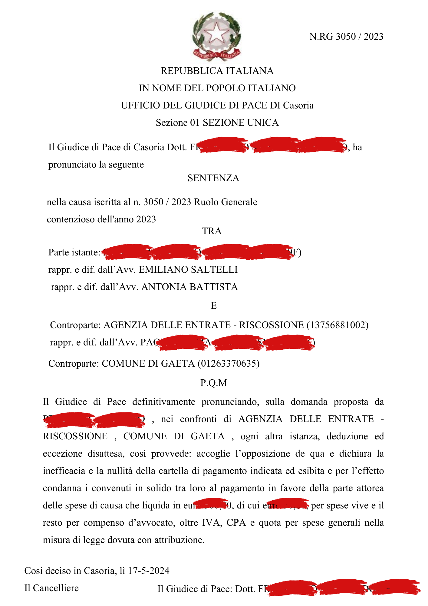 Ancora una vittoria per lo Studio Legale Saltelli, che ha ottenuto l’annullamento totale di una cartella esattoriale davanti al Giudice di Pace di Casoria, dimostrando l’inesistenza del credito vantato dall’ente di riscossione.