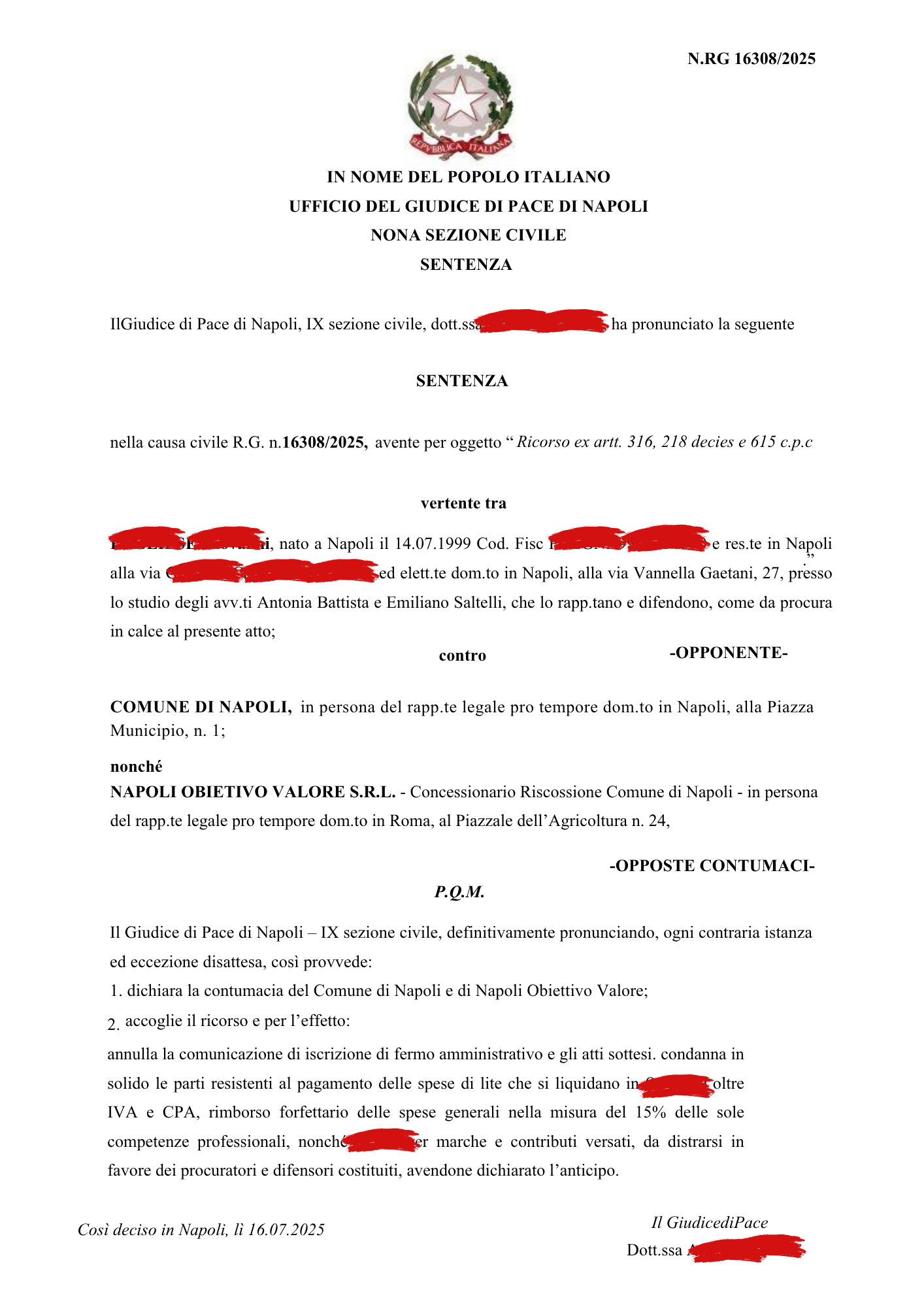 Un’altra vittoria per il nostro Studio Legale Saltelli. Il Giudice di Pace di Napoli ha annullato una ingiunzione di pagamento emessa da Napoli Obiettivo Valore S.r.l. per conto del Comune di Napoli.
