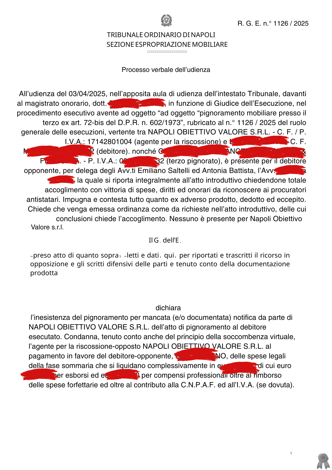 Il Tribunale di Napoli – Sezione Esecuzioni Mobiliari – ha riconosciuto l’illegittimità dell’azione esecutiva promossa da Napoli Obiettivo Valore S.r.l., dichiarando inesistente il pignoramento per gravi vizi procedurali.
