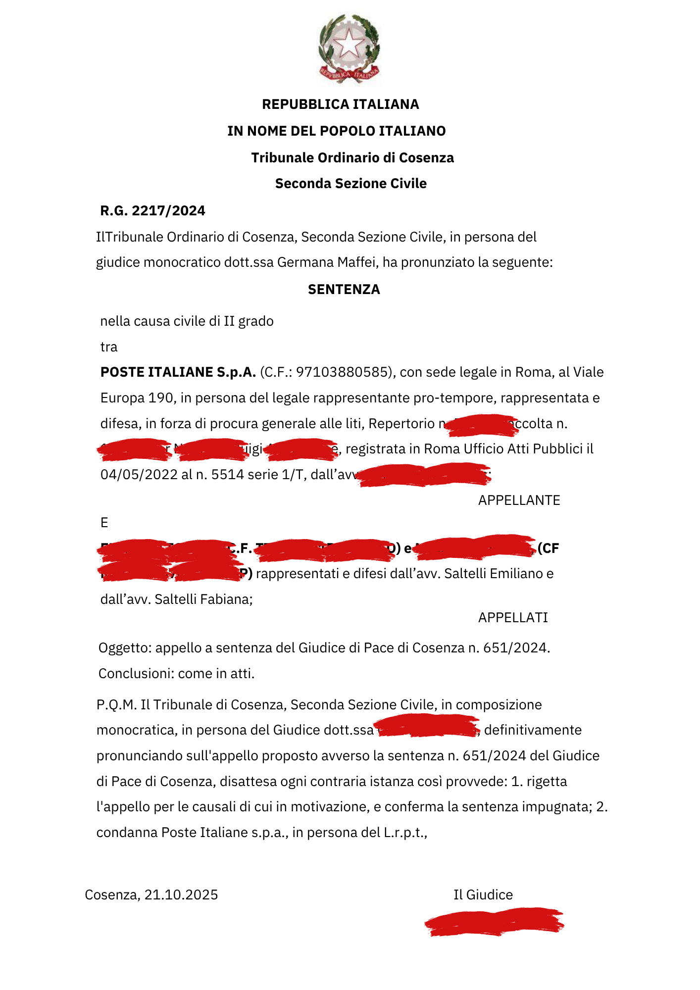 Il Tribunale di Cosenza ha confermato la vittoria ottenuta in primo grado dal nostro studio legale contro Poste Italiane S.p.A., dando ragione ai nostri assistiti, difesi dagli avv.ti Emiliano Saltelli e Fabiana Saltelli, in una causa relativa al rimborso di un buono fruttifero postale.